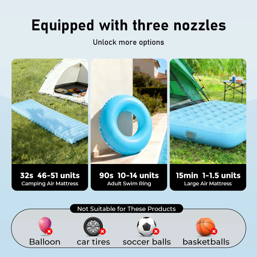 Compacta, potente e fácil de usar, a Mini Bomba de Ar Portátil 180L/Min é ideal para colchões de ar, boias, piscinas, sofás infláveis e outros produtos de camping ou lazer. Com função de inflar e desinflar, ela garante praticidade e eficiência em qualquer lugar.