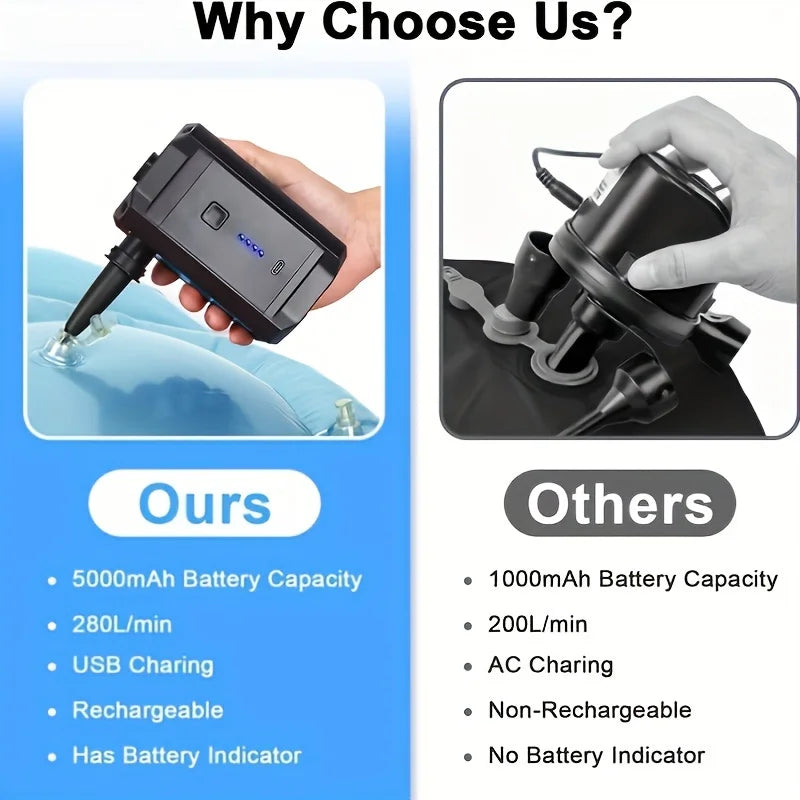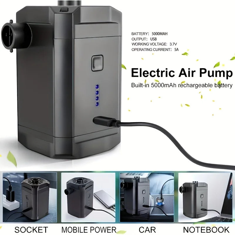 Tenha praticidade e potência onde quiser com a bomba de ar portátil recarregável de 5200mAh! Compacta, leve e multifuncional, ela é perfeita para acampamentos, praias, piscinas, colchões de ar, boias e sofás infláveis. Além disso, também pode ser usada para desinflar rapidamente, economizando tempo e esforço.